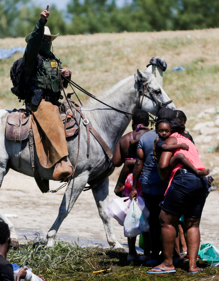 Конные офицеры в ковбойских шляпах преграждали путь мигрантам. Один из пограничников развернул поводья, похожие на хлыст, и размахивал ими перед лицом мигранта. Некоторые сравнили этот образ с исторической несправедливостью, от которой страдают чернокожие люди в США.