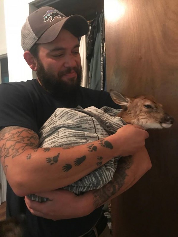 Выжившего олененка полицейские забрали к себе домой, чтобы отогреть и разработать его слаборазвитые легкие.