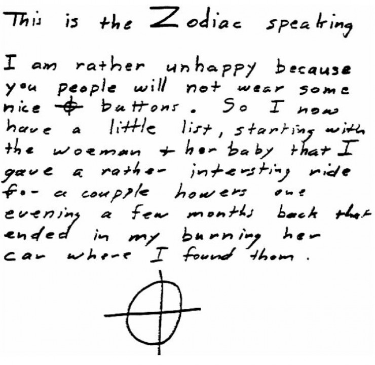 Как сообщают РИА Новости, серийный убийца по кличке Зодиак убил, по его собственным заявлениям, в общей сложности 37 человек за 1968-1969 годы. Он прославился тем, что после каждого убийства отправлял в газеты письма с зашифрованными посланиями и окровавленными фрагментами одежды жертв. В криптограммах было зашифровано имя убийцы, но полиции так и не удалось его поймать. Всего было составлено четыре криптограммы. Первую удалось разгадать школьному учителю.