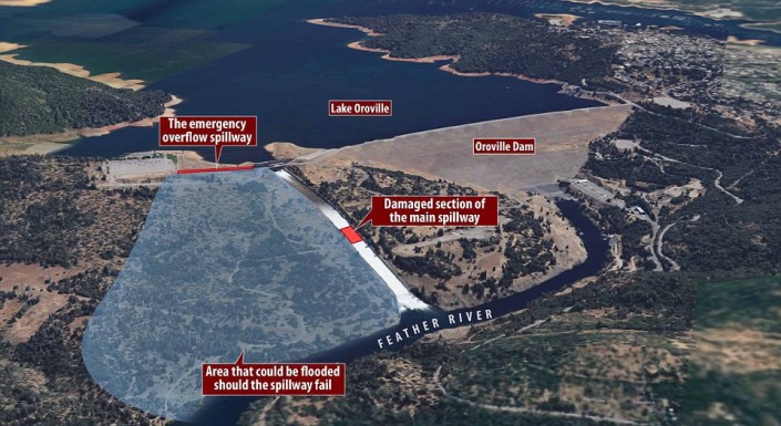 В субботу из-за сильных дождей началась эрозия сначала основного, а затем и вспомогательного водосбросов дамбы. По словам шерифа округа Батте, это может привести к "неконтролируемому сбросу воды из озера Оровилл" и затоплению ближайших населенных пунктов - Оровилл, Гридли, Биггс, Юба-Сити, Лома Рика, Лайв Ок, Мэрисвилл, Уитленд и других.
