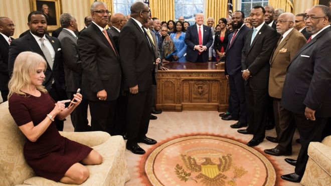 Конуэй сфотографировали в Овальном кабинете на фоне президента Дональда Трампа, который позировал перед камерами вместе с руководителями исторически "черных" высших учебных заведений (HBCU) - особой категории вузов на территории США, созданных начиная со второй половины XIX века специально для обучения афроамериканского населения. Напомним, фотография Конуэй вызвала шквал критики в соцсетях. При этом на других снимках видно, что она фотографирует Трампа и гостей на телефон. Пользователи социальных сетей обвинили Конуэй в неуважении к Овальному кабинету, народу США и президенту страны.