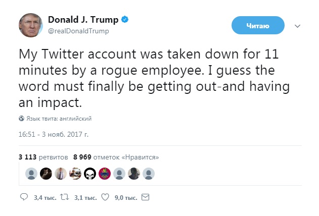 "Моя учетная запись в Twitter была отключена на 11 минут сотрудником-изгоем. Я думаю, мои слова наконец-то были услышаны и возымели влияние", - написал глава США в своем аккаунте.