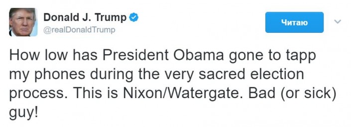 "Как низко мог опуститься президент Обама, чтобы прослушивать мои телефонные разговоры по время сакрального избирательного процесса. Это Уотергейтский скандал Никсона. Плохой (или ненормальный) парень", - написал Трамп в Twitter.