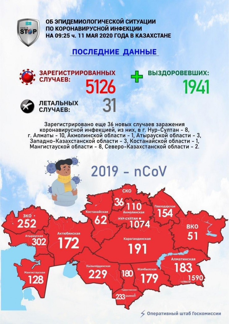 На 09.25 11 мая эпидемиологическая ситуация в Казахстане складывается так: