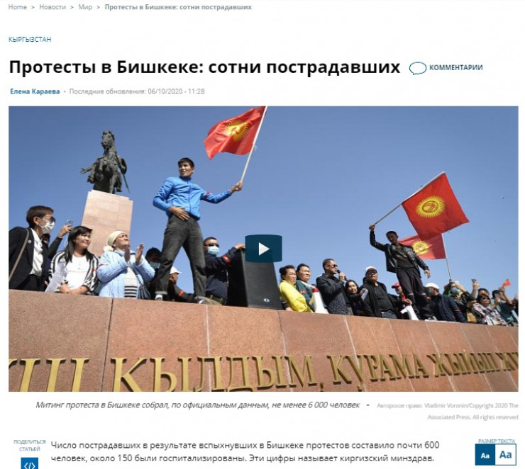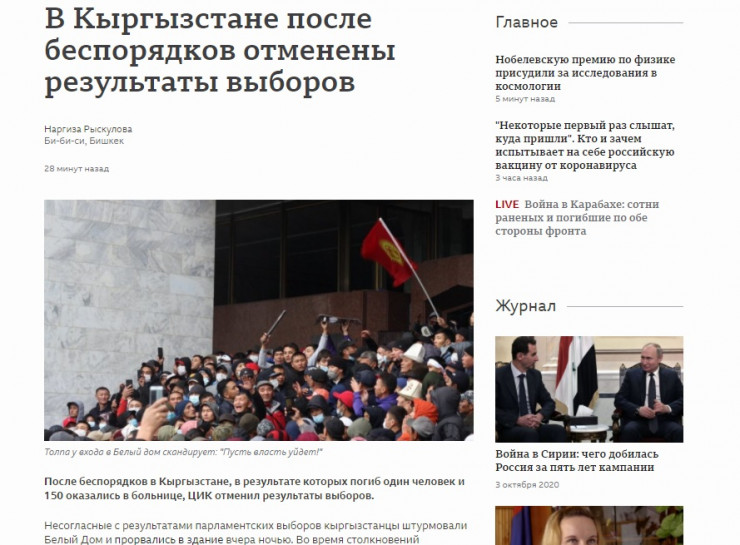 Ұлыбританиялық ВВС Қырғыз елінде жаппай тәртіпсіздіктерден кейін сайлау нәтижелері жойылғанын жазған. Ақпаратты ВВС-дің Бішкектегі меншікті тілшісі Наргиза Рыскулова таратқан. 6 қазанда шыққан мақалада Қырғызстандағы жағдай толық баяндалған.
