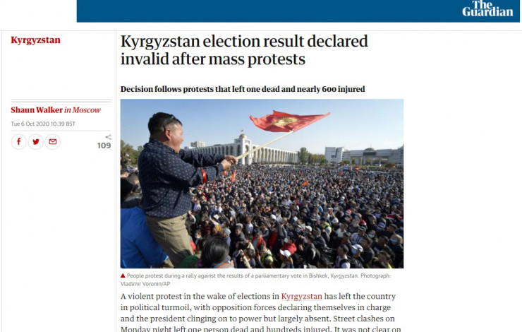 Тағы бір ұлыбританиялық The Guardian газетінің сайты да Қырғызстандағы парламент сайлауының нәтижесі жойылғаны туралы ақпаратқа назар аударған.
