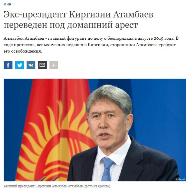 Ал Deutsche Welle неміс толқынының соңғы мәліметтері бойынша, Алмазбек Атамбаев үйқамаққа ауыстырылған. Бішкекте митингіге шыққандар экс-президент Алмазбек Атамбаевты Ұлттық қауіпсіздік мемлекеттік комитетінің тергеу изоляторынан босатып алған болатын. Олар бірден экс-президентті қолдап, "Атамбаев" деп айғайлады.