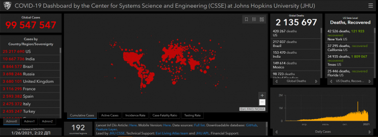 На сайте Университета Джонса Хопкинса есть данные о 99 547 547 случаях заражения в мире.