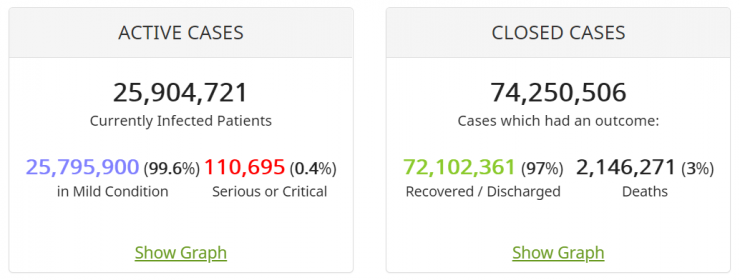 По данным сайта, на сегодня больными остаются 25 904 721 человек. Из них у 25,8 миллиона, или 99,6 процента, заболевание протекает в легкой форме, а у 110 695, или 0,4 процента - в тяжелой или критической.