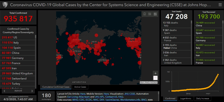 Как информирует Университет Джонса Хопкинса (США), число смертей из-за коронавируса во всем мире превысило 47 тысяч, количество заразившихся - 935 817, выздоровели около 193 тысяч пациентов. COVID-19 проник в 180 стран.
