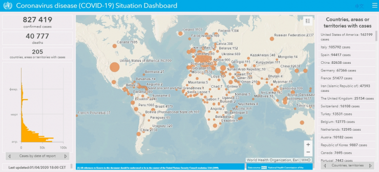 Количество зарегистрированных случаев заражения коронавирусом во всем мире составляет 827 419, за все время скончались 40 777 человек в 205 странах. Такие цифры приводятся на сайте Всемирной организации здравоохранения (ВОЗ).