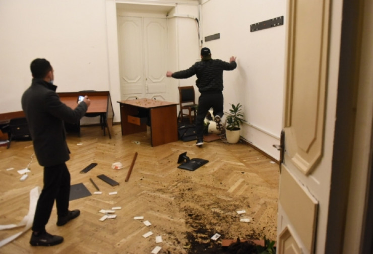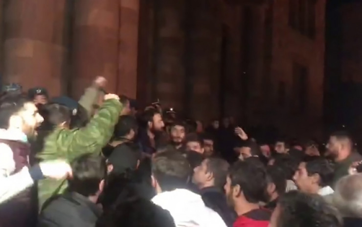 Затем протестующие пробились в здание парламента. Немногочисленная охрана пыталась преградить им путь, однако протестующие буквально смяли охранников и ворвались в зал заседаний. Они заняли трибуну, с которой стали выступать все желающие и требовать продолжения боевых действий в Карабахе.