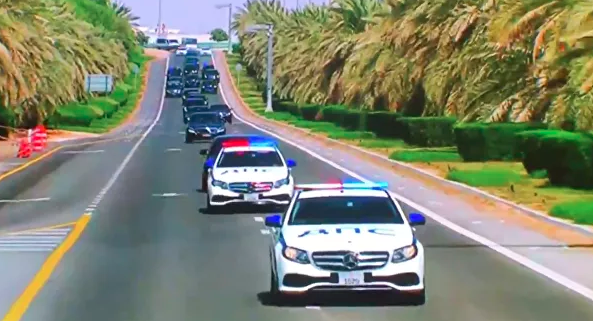В Абу-Даби кортеж Путина сопровождали конная гвардия, королевская пехота и автомобили Mercedes-Benz с эмиратскими номерами, на капотах которых красовались синие русские буквы "ДПС" и "полиция".