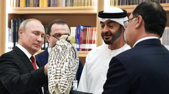 Владимир Путин дарит белого кречета наследному принцу Абу-Даби Мухаммеду бен Заиду Аль Нахайяну. © РИА Новости