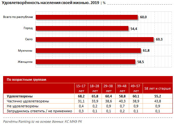 Ежегодно Комитет по статистике РК проводит опрос жителей по анкете "Качество жизни населения". Согласно результатам исследования, 60 процентов опрошенных удовлетворены своей жизнью. По сравнению с аналогичным исследованием предыдущего года уровень удовлетворенности жизнью вырос (в 2018 году - 56,6 процента). Еще 39,2 процента респондентов в текущем году частично удовлетворены своей жизнью, а не удовлетворены всего 0,7 процента опрошенных.
