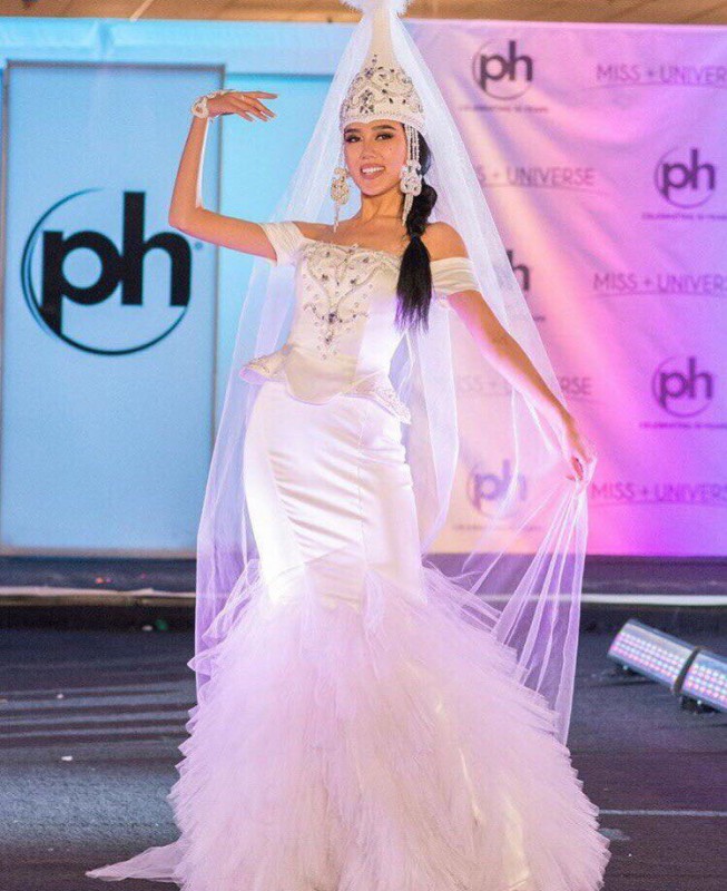 Для казахстанки национальное платье создала казахстанский дизайнер Малика Усупова. Вечернее платье у девушки было от бренда Sherri Hill.
