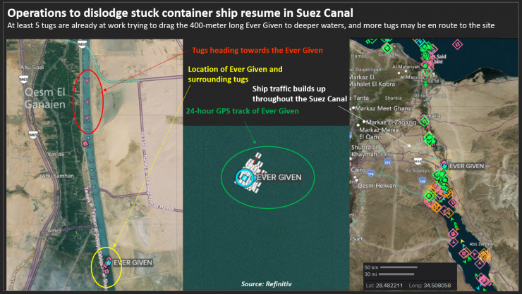 В заявлении Управления Суэцкого канала (SCA) говорится, что восемь самых больших буксиров пытались вытолкнуть Ever Given из канала, но пока безуспешно. Сигнал GPS корабля показывает лишь незначительные изменения его местоположения за последние 24 часа.