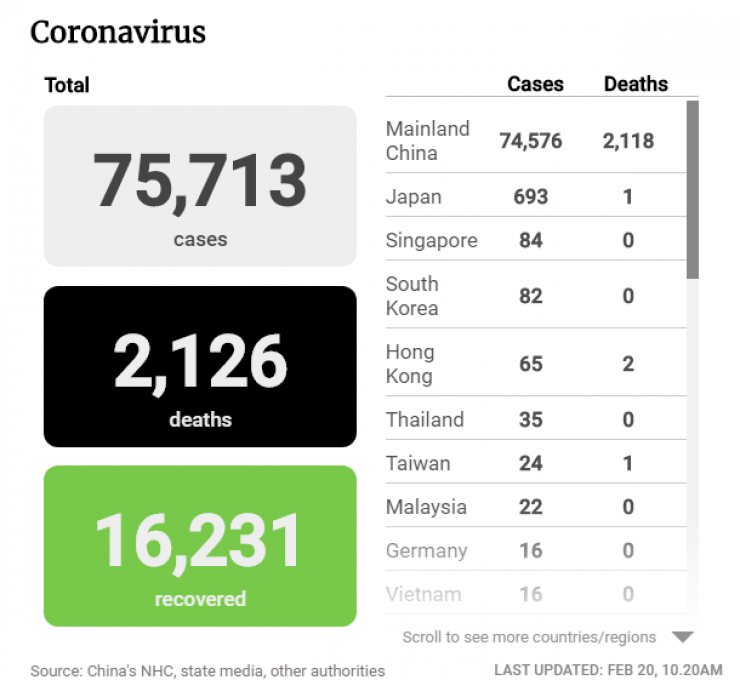 По состоянию на утро 20 февраля общее количество заразившихся новым типом коронавируса по всему миру составило 75 713 человек, число жертв достигло 2126 человек. Еще 16 231 пациент выписан из больниц. Об этом сообщает South China Morning Post со ссылкой на органы здравоохранения Китая.