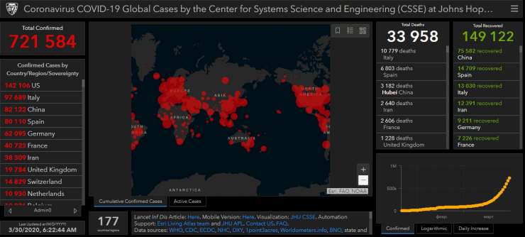 Как информирует Университет Джона Хопкинса (США), число смертей из-за коронавируса во всем мире приблизилось к 34 тысячам, количество заразившихся - 721 584, выздоровели около 150 тысяч пациентов. COVID-19 проник в 177 стран.