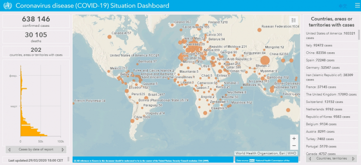 По состоянию на утро 30 марта количество зарегистрированных случаев заражения коронавирусом во всем мире составляет 638 146, за все время скончались 30 105 человек, заболевание зафиксировано в 202 странах мира. Об этом сообщается на сайте Всемирной организации здравоохранения (ВОЗ).