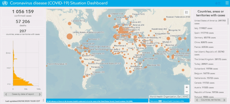 По состоянию на утро 5 апреля количество зарегистрированных случаев заражения коронавирусом во всем мире составило 1 056 159, жертвами COVID-19 стали 57 206 человек в 207 странах и территориях. Такие цифры приводятся на сайте Всемирной организации здравоохранения (ВОЗ).