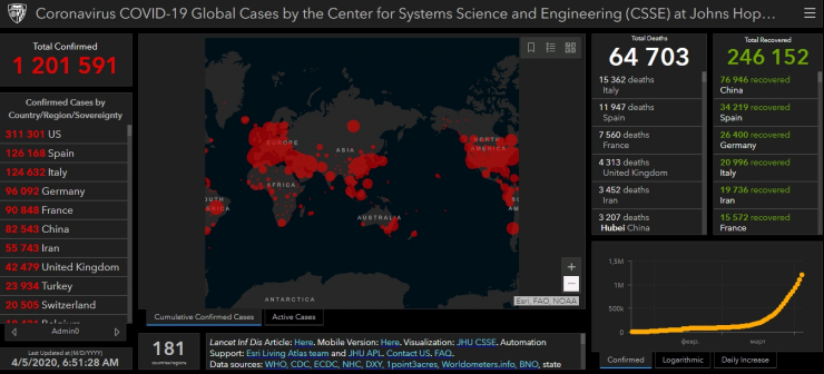 Как информирует Университет Джонса Хопкинса (США), число смертей из-за коронавируса во всем мире превысило 64 тысячи, количество заразившихся составило 1 201 591, выздоровели свыше 246 тысяч пациентов.