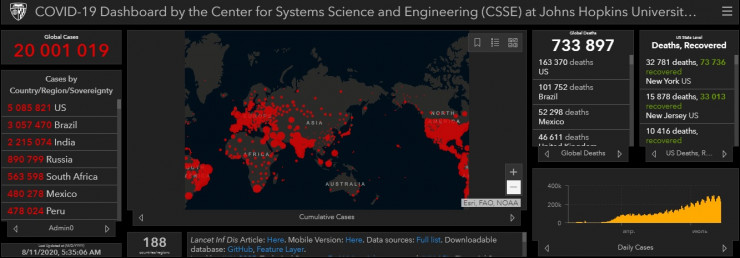 По данным университета, в мире COVID-19 заболели 20 001 019 человек, жертвами инфекции стали 733 897 пациентов, еще 12 209 074 человека выздоровели.