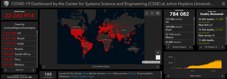 По данным университета, в мире COVID-19 заболели 22 260 914 человек, жертвами инфекции стали 784 082 пациента, еще 14 198 187 человек выздоровели.