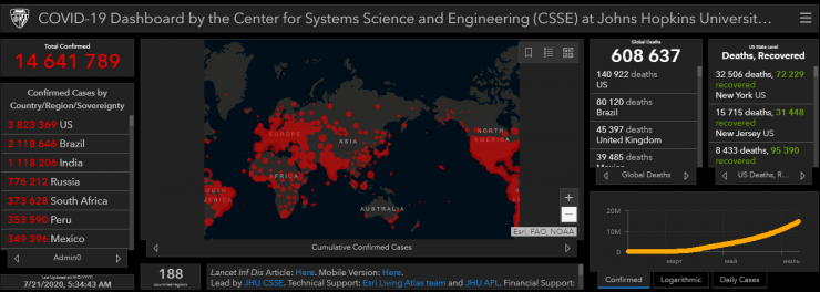 По данным университета, в мире COVID-19 заболели 14 641 789 человек, жертвами инфекции стали 608 637 пациентов, еще 8 222 979 человек выздоровели.