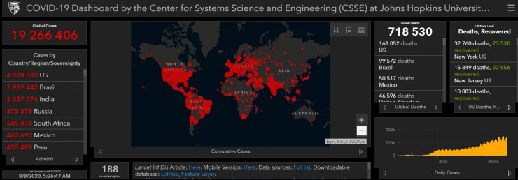 По данным университета, в мире COVID-19 заболели 19 266 406 человек, жертвами инфекции стали 718 530 пациентов, еще 11 671 253 человека выздоровели.