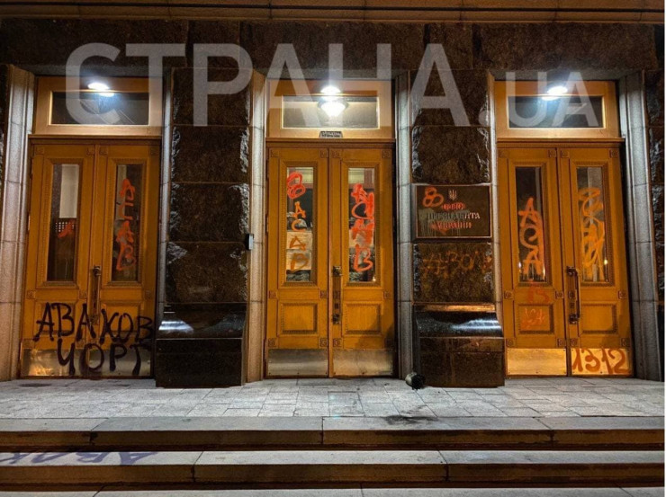 Участники демонстрации, которая прошла, несмотря на введенный в Киеве локдаун и запрет на собрания, разбили стекла президентской резиденции, раскрасили ее фасад оскорбительными надписями в адрес главы МВД Арсена Авакова и Владимира Зеленского ("чорт", "лох" и другие) и свастикой.