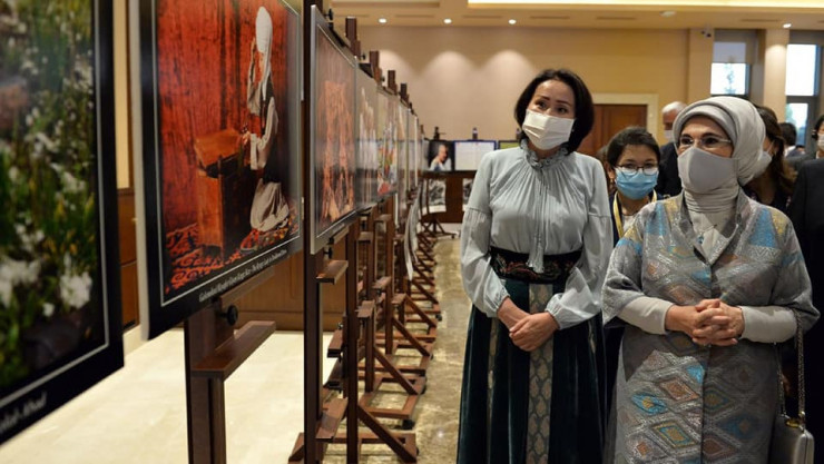 На это мероприятие первая леди Кыргызстана переоделась в национальное платье с белдемчи. Эмине Эрдоган поделилась фотографией со встречи на своей странице в Twitter.