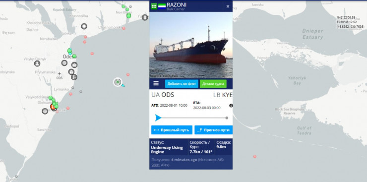 Сухогруз Razoni под флагом Сьерра-Леоне отправился из порта Одессы утром 1 августа. Судно с 26 тысячами тонн украинской кукурузы направляется в Ливан.