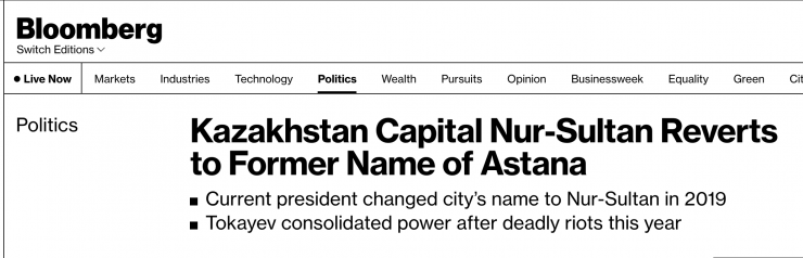 Портал EurasiaNet выпустил статью под заголовком "Казахстан: Столица возвращается к названию Астана после кратковременного пребывания Нур-Султаном". Журналисты сайта подчеркнули, что за свою относительно короткую историю город менял название по меньшей мере шесть раз.
