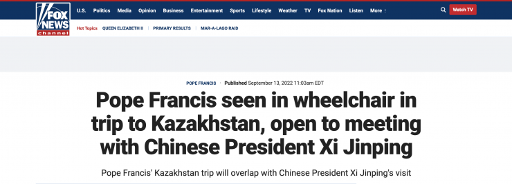 На американском телеканале Fox News написали, что Папа Римский Франциск прибыл в Казахстан, чтобы совершить трехдневное турне по стране, встречаясь как со светскими, так и с религиозными лидерами. Также на телеканале отметили, что окончательный результат поездки остается открытым для спекуляций, поскольку в расписании папы остается возможность встречи с председателем КНР Си Цзиньпином, который будет находиться в Казахстане одновременно с понтификом.