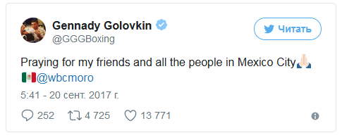 "Помолимся за моих друзей и всех людей в Мехико!" - написал Головкин.