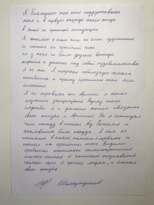 Шамсутдинов не понимает, в какой момент он "сорвался". "Я не скрывался от армии, хотел защищать Родину, после службы хотел связать свою жизнь с армией. Не ожидал, что попаду в такой ад. Бежать и жаловаться было некуда. Видимо, сработал инстинкт самосохранения. Только сейчас я начинаю осознавать, сколько горя я принес людям и что сломал свою жизнь", - написал рядовой.