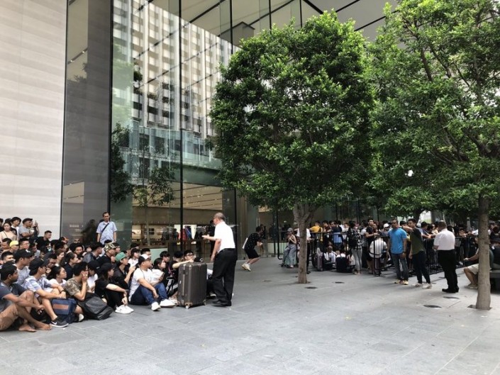 Возле магазина в Сингапуре в очереди стоят сотни людей, желающие купить новый телефон.
