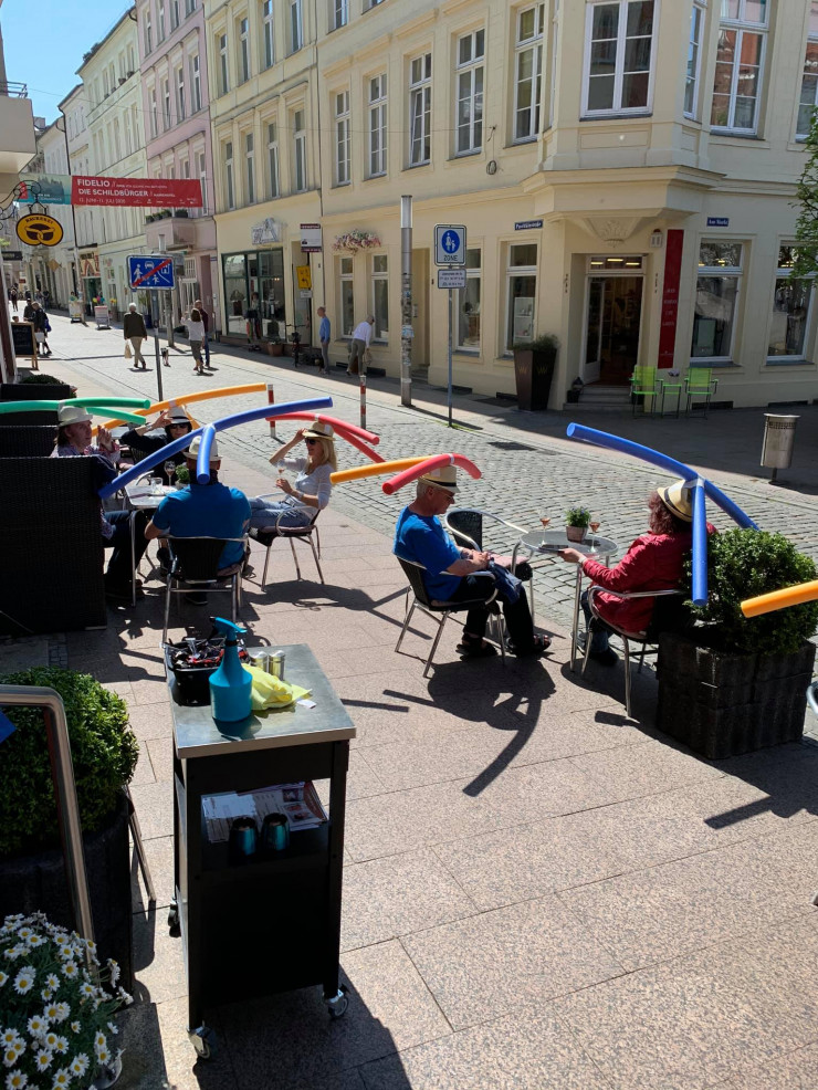 Германияда тамақтану орындары мамырдың тоғызында ашыла бастаған. Алайда бұл елде де әлеуметтік арақашықтық мәселесі өзекті. Шверина қаласындағы Rothe кондитерлік кафесінің иелері қонақтарды бір-бірінен алшақ отырғызудың қарапайым жолын тапқан. Келушілерге басына полиэтиленнен жасалған түтікше тағып отыру ұсынылған. Кафе иесі Жаклин Роте CNN-ге берген сұхбатында келушілерге мұндай әдіс ұнағанын, алайда бұл тәжірибе күнделікті өмірде арақашықтықты сақтау қаншалықты қиын екенін көрсеткенін айтады.