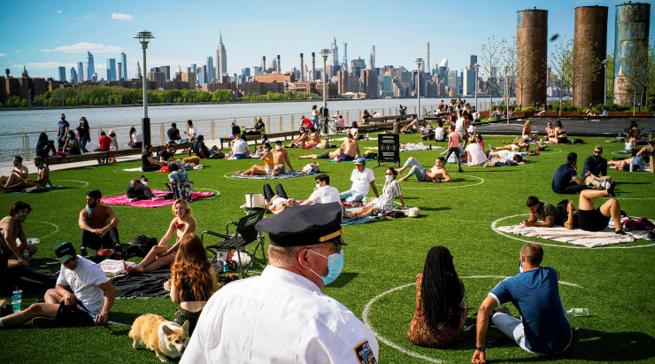 Бұл Нью-Йорктегі Домино саябағы арақашықтықты сақтау үшін ойлап тапқан әдісі. Расында, жергілікті тұрғындар сызылып, бөлінген шеңберге орналасып, демалуды жөн санаған.
