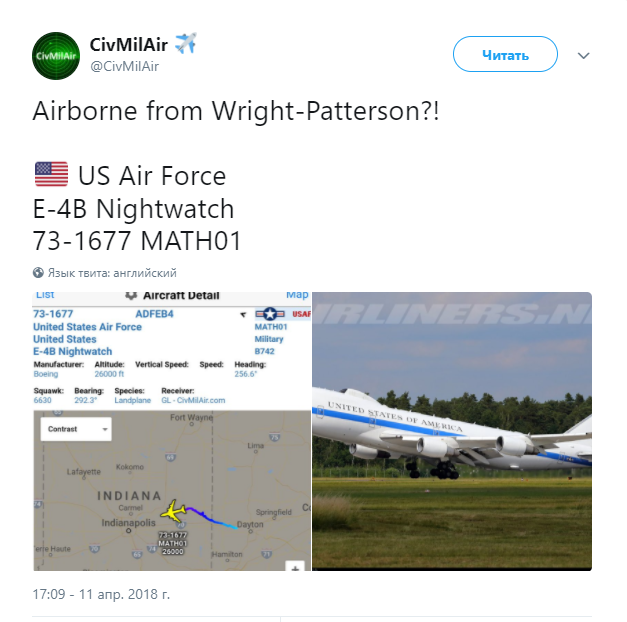 Информации о том, почему самолет подняли в воздух, пока нет. По данным СМИ, E-4B сопровождает президента США во время некоторых зарубежных поездок.