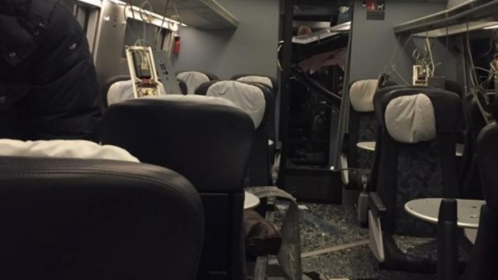 На сайте радио поясняется, что авария произошла после того, как часть покрытия крыши сорвалась с грузового поезда и угодила в проходящий мимо пассажирский поезд, который был вынужден резко затормозить.