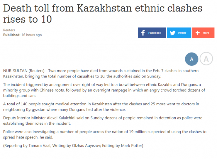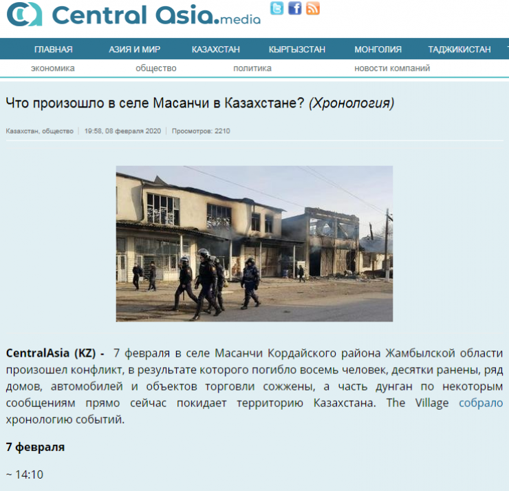 "Полицейлер мен тұрғындар арасындағы қақтығыс (дүнгендер мен қазақтар) Жамбыл облысы, Қордай ауданындағы бірқатар ауылдарда болған. Жаппай қақтығыс 7 ақпан күндізгі уақытта басталып, 8 ақпан түнгі уақытта жалғасқан", - деп хабар таратқан компания.