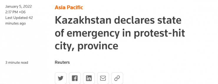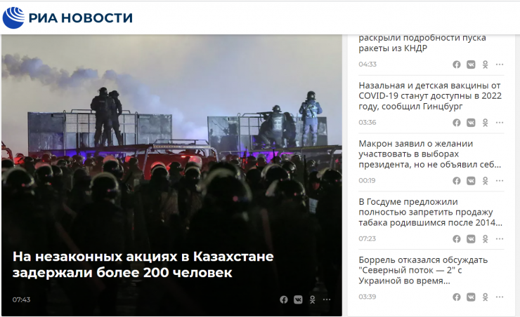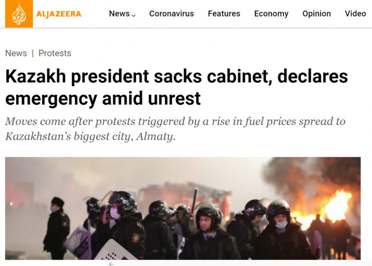 Материалда жексенбіде, 2 қаңтарда Маңғыстау облысында сұйытылған газ қымбаттауына байланысты басталған наразылық шарасы сейсенбіде, 4 қаңтарда елдің өзге ірі қалаларына ұласып кеткені жазылған.