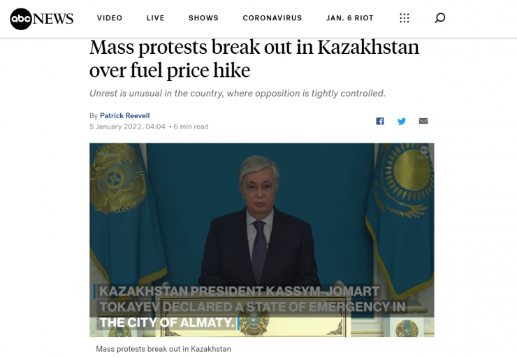 Америкалық ABC телеарнасының жаңалықтар бөліміндегі сайтта Қазақстандағы наразылық акциясы туралы екі материал тұр. Жаңалықтар бөлімі Алматыда митинг кезінде Интернет өшірілгенін атап өткен. Сонымен қатар, сайтта Алматыдағы жағдай туралы баяндалған.