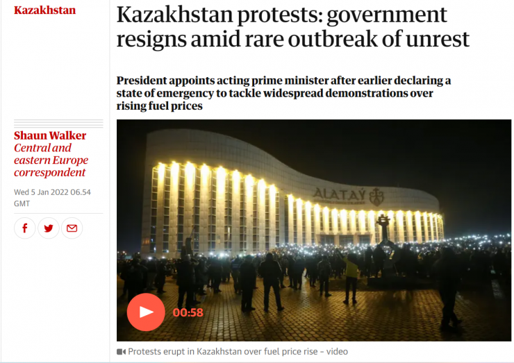 Ұлыбританиядағы ескі газеттердің бірі The Guardian елдегі жалпы жағдайға шолу жасап шыққан. Басылым "Қазақстандағы наразылықтар: үкімет сирек кездесетін тәртіпсіздік жағдайында отставкаға кетеді" деген тақырыппен материал жариялаған.