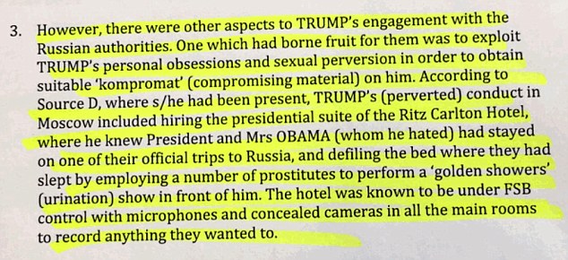 В частности, в тексте kompromata (в документе так и написано) говорится, что спецслужбы располагают свидетельствами "сексуальной жизни" Трампа. "Согласно источнику, Трамп снимал проституток в президентском люксе отеля Ritz Carlton. Там, как ему было известно, во время визита в Россию останавливались Барак и Мишель Обама. Отель находится под контролем ФСБ, поэтому во всех комнатах установлены микрофоны и скрытые видеокамеры, которые все записывают", - приводит текст файла RT.