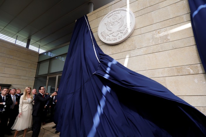 После слов Трампа министр финансов США Стив Мнучин снял голубую ткань с герба Соединенных Штатов на здании генконсульства и с вывески - теперь дипмиссия приобрела статус посольства.