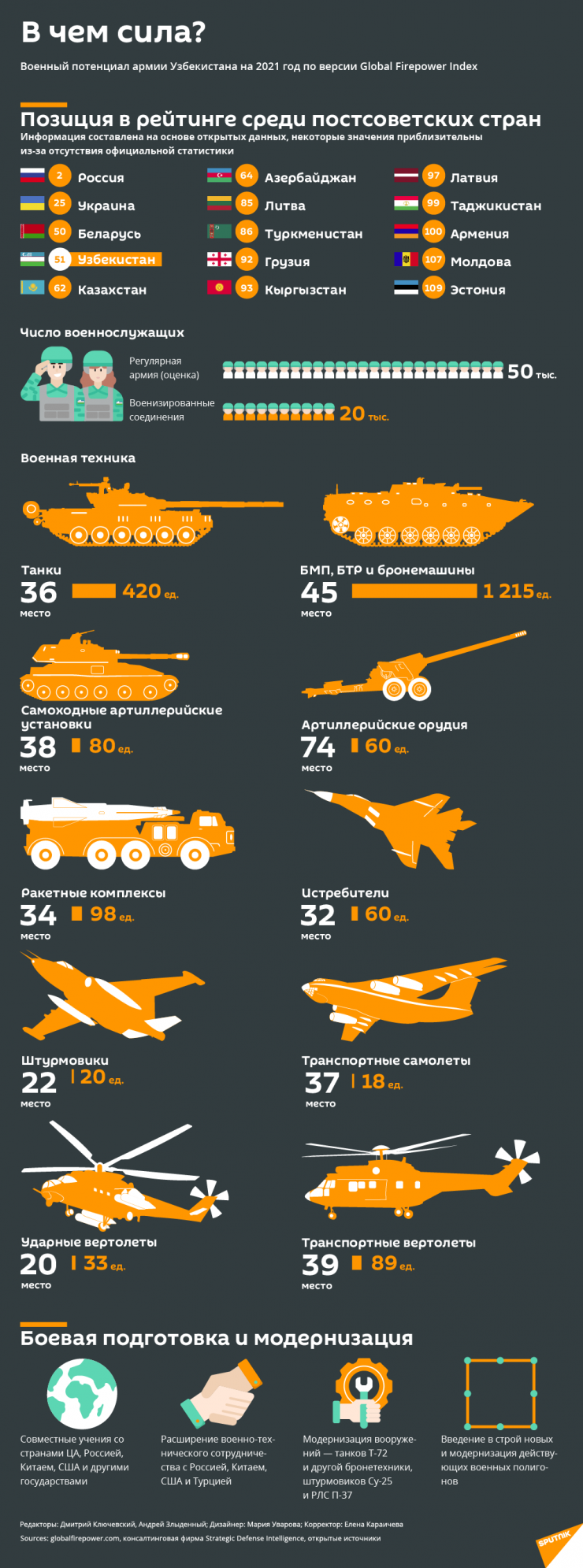 Армия Узбекистана улучшила позиции в международном рейтинге вооруженных сил Global Firepower в 2021 году, заняв 51-ю строчку и оставаясь сильнейшей в Центральной Азии, сообщает Tengrinews.kz со ссылкой на Sputnik-Узбекистан