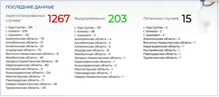В Казахстане на данный час число заражений составляет 1267 случаев. Умерли 15 человек. Процент летальности в Казахстане - 1,1.